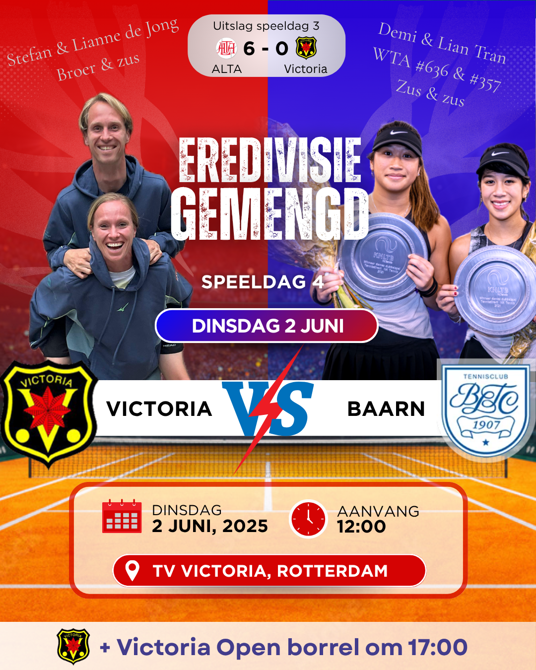 We zijn verheugd om aan te kondigen dat Victoria Tennis gepromoveerd is naar de hoogste tenniscompetitie van Nederland: de Eredivisie Gemengd! Deze competitie bestaat uit professionele Nederlandse tennissers, inclusief namen als Jesper de Jong (ATP #94), Jelle Sels (ATP #281) en Michaëlla Krajicek (voormalig WTA #30). Een enorme uitdaging voor dit vriendenteam dus, waarbij alle support welkom is! Kom onze spelers aanmoedigen tijdens onze thuiswedstrijden.